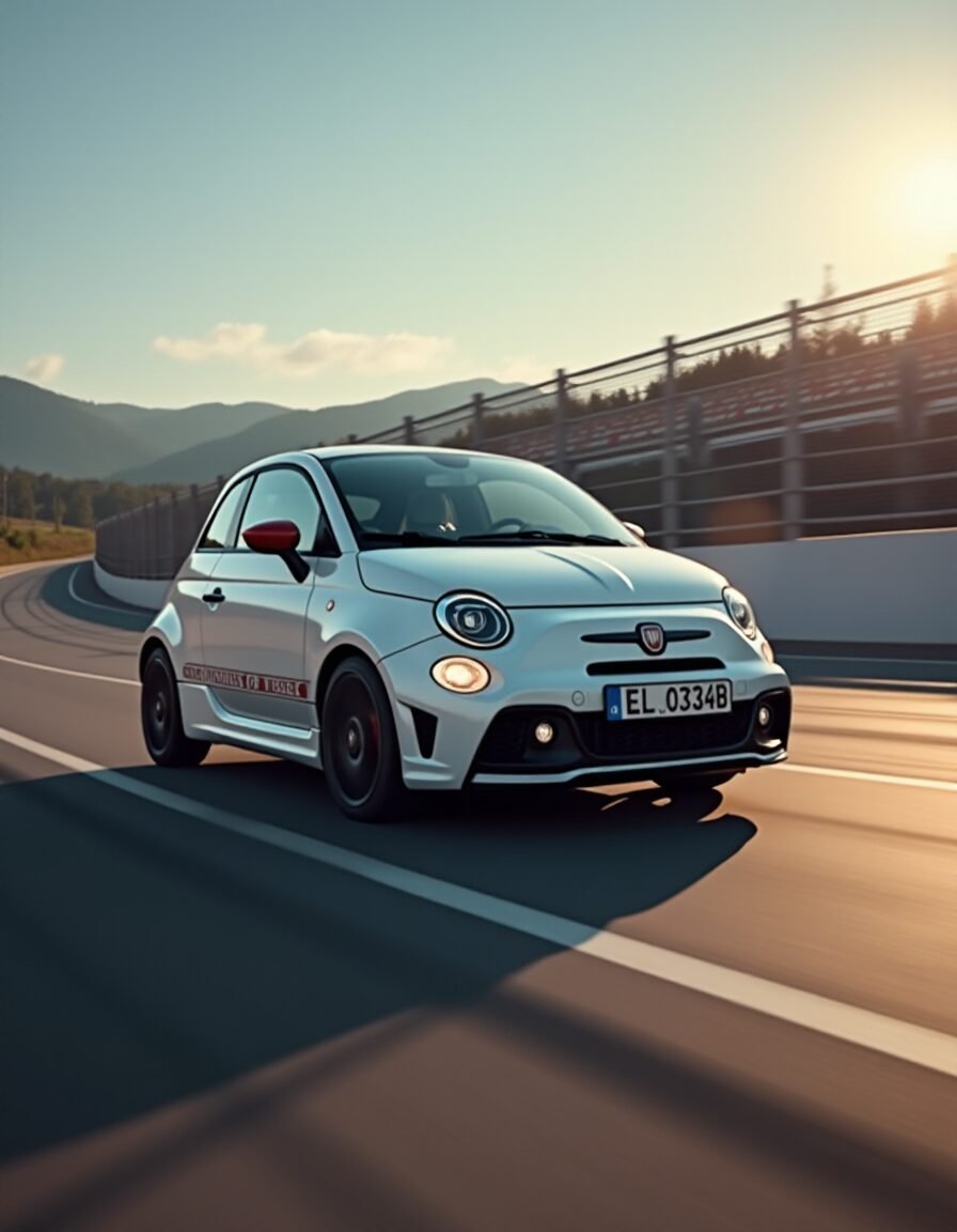 Imagem: um Fiat 500 numa pista de corrida. O carro usa motor TwinAir em algumas versões. Crédito: Arte/Blogolandia